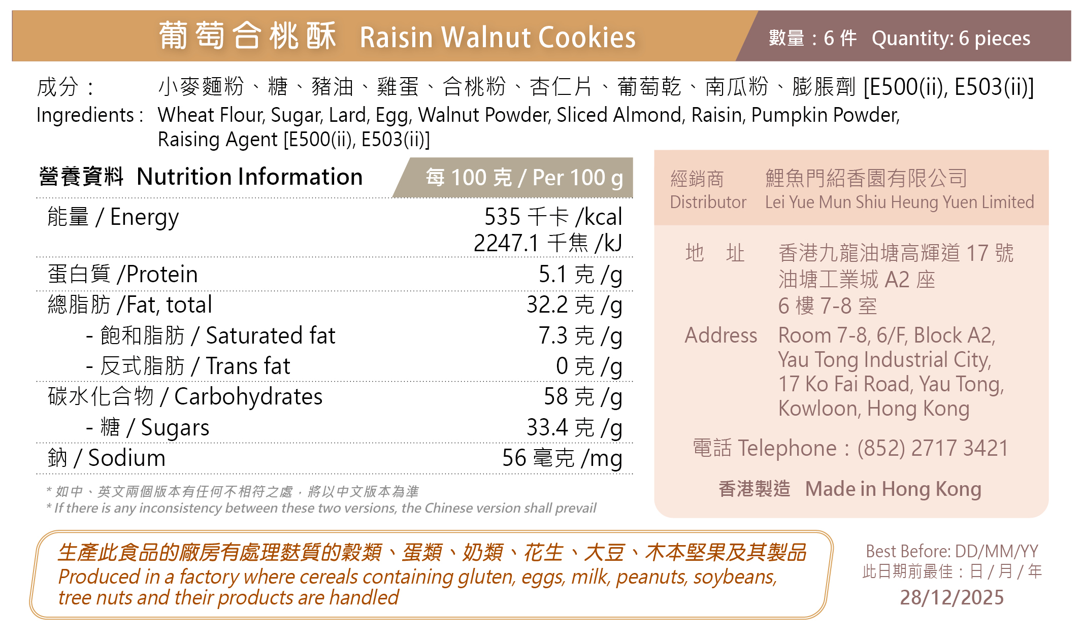 售罄 尚馀899件 慈善葡萄合桃酥 HK$ 50.00 与朋友分享 复制到剪贴板 商品属性 購買/轉贈葡萄合桃酥: 购买「慈善葡萄合桃酥」并需要送货服务 参与转赠计划 - 将慈善葡萄合桃酥转赠予弱势社群 数量 (每包) 加入购物车 与朋友分享 复制到剪贴板 产品介绍 产品详情 慈善葡萄合桃酥 由香港着名传统饼食及零食品牌绍香园出品,葡萄合桃酥经传统饼师用心制作,创新口味有别于一般市面上的合桃酥。特别加入葡萄干的香甜,外层松脆可口,令人一试难忘。 善长可选择透过福利协会将认购的慈善葡萄合桃酥转赠予基层儿童或其他有需要人士,为他们送上祝福及温暖,分享美味。 成份:小麦面粉、糖、猪油、鸡蛋、合桃粉、杏仁片、葡萄干、南瓜粉、膨胀剂[E500(ii), E503(ii)] 数量:6件 此日期前最佳:28/12/2025